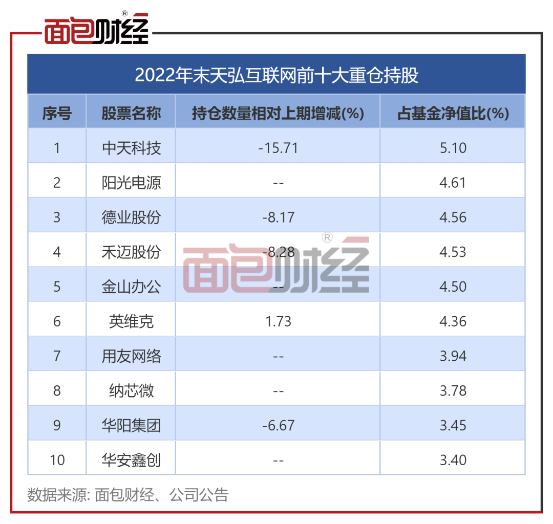 第四季度,该基金持仓集中度有所下降,前十大重仓股持仓市值占基金净值的比例由三季度末的49.81%降至四季度末的42.23%。第一大重仓股中天科技持股数量较上期末减少15.71%;德业股份、禾迈股份持股数量较上期末减少逾8%。此外,阳光电源、金山办公、用友网络等股票重新进入前十大持仓。