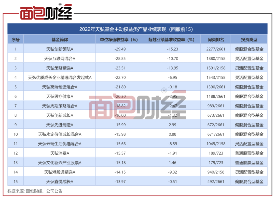 天弘创新领航A份额2022年单位净值下跌29.49%,跑输业绩比较基准逾15个百分点,同类排名2277/2661。此外,天弘策略精选A、天弘优质成长企业精选混合A等多只产品去年回撤均超过20%。