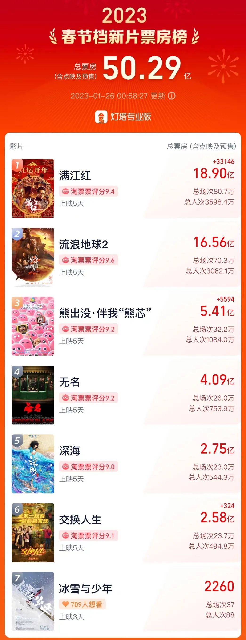 我们先看一组数据。据灯塔专业版实时数据,1月25日21时43分,2023春节档(1月21日-1月27日)总票房(含预售)突破50亿,《满江红》《流浪地球2》《熊出没·伴我“熊芯”》分列票房榜前三位。