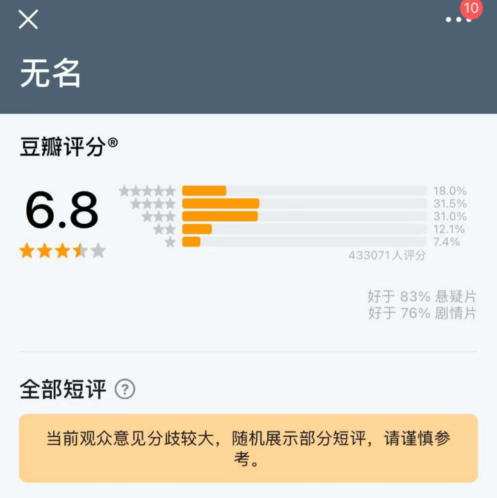 这部电影豆瓣之所以迟迟没有开分,是因为系统检测到了很多恶意的差评,大量的水军差评的模板都是非常相似的,因此黑粉触发了系统的保护机制,系统需要经过识别之后,才能给出更加客观的评分。目前豆瓣开分6.8,并在网页端也挂出了特别提示:“当前观众意见分歧较大,随机展示部分短评,请谨慎参考。”
