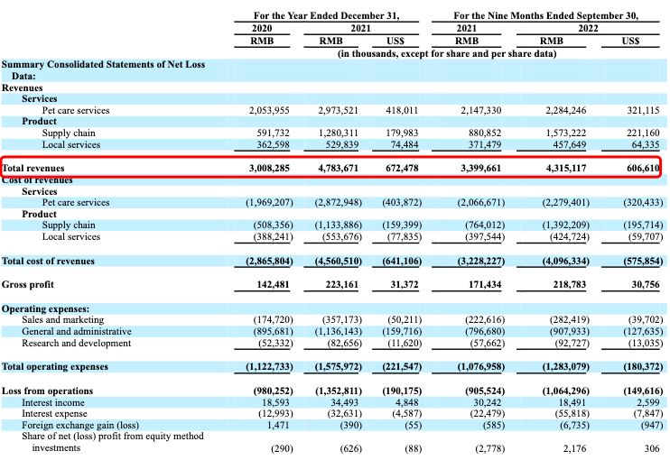 作为宠物江湖的隐秘老大,新瑞鹏营收如何?招股书显示,新瑞鹏2020年、2021年的总营收分别为30.08亿元、47.84亿元;2021年前三季度和2022年前三季度总营收分别为34亿元、43.15亿元。其中,宠物医疗服务是新瑞鹏最为主要的收入来源,占比超50%。不过,新瑞鹏当前仍处于“增收不增利”的亏损状态——2020与2021两年净亏损累计亏损超20亿元,去年前三季度亏了11.09亿元。