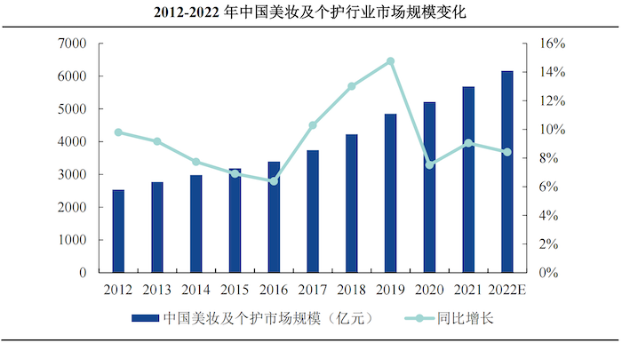 Euromonitor数据显示,我国美妆及个护行业市场规模由2012年的2535.59亿元增至2021年的5686.05亿元,复合增长率为9.39%,已发展成为仅次于美国的全球第二大美妆及个护产品消费市场。2022年我国美妆及个护行业市场规模预计将增长至6164.33亿元。