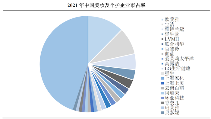 2021年,我国美妆及个护行业CR10与CR20分别为43.70%及55.10%。美妆及个护行业仍由海外龙头企业主导,本土企业占比相对较低,前十大企业中,本土企业仅2家,公司的市场占有率也处于较低水平。