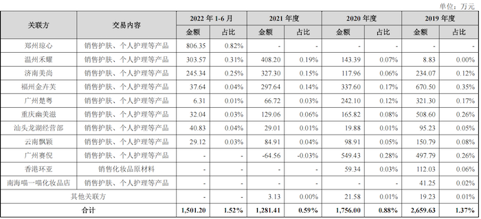 其中,郑州琼心及其关联方系公司美肤宝MEIFUBAO、滋源SEEYOUNG等品牌产品在河南地区的经销商。2022年1-6月,环亚科技向郑州琼心及关联方之间的关联销售为806.35万元。