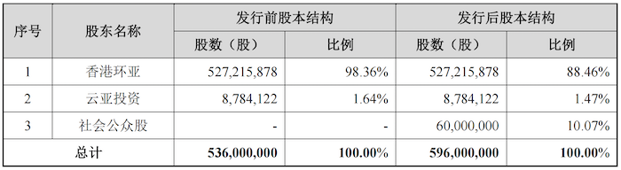 上市前,环亚科技的股权结构高度集中,公司仅香港环亚和云亚投资两名股东,其中外资股东香港环亚持有公司98.36%的股份,为公司的控股股东,云亚投资系公司的员工持股平台,持股比例为1.64%。