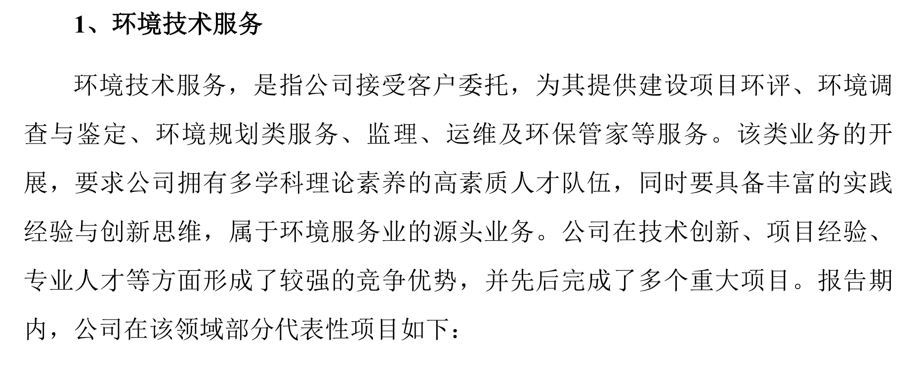 目前,公司业务以环境技术服务为主,在该领域部分代表性项目有:常熟经济技术开发区碳排放评估及双碳实施路径项目、中天绿色精品钢(通州湾海门港片区)示范工程环境影响评价项目、内蒙古自治区典型工业园区减污降碳协同治理与环境效应研究项目等。