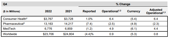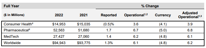 2022全年,消费者健康部门销售额149.5亿美元(约人民币1014亿元),同比下降0.5%,去除汇率影响后同比增长3.6%;制药部门销售额525.6亿美元(约人民币3566亿元),同比增长1.7%,去除汇率影响后同比增长6.7%;医疗科技部门销售额274.2亿美元(约人民币1860亿元),同比增长1.4%,去除汇率影响后同比增长6.2%。