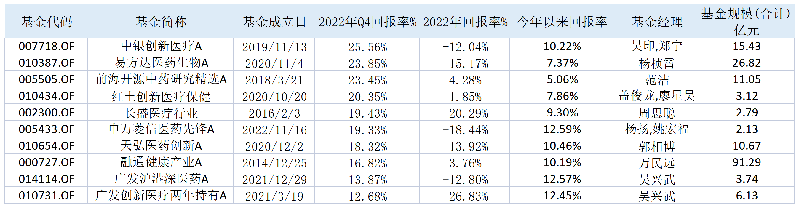 进入2023年,医药板块的反弹仍在持续。中银创新医疗今年以来回报率为10.22%。该基金成立于2019年11月13日,由吴印、郑宁管理,截至去年四季度末规模为15.43亿元。易方达医药生物今年以来回报率也达到了7.37%。