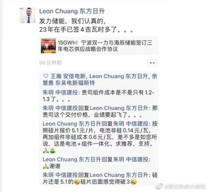 这样一位光伏业的老兵,为何突然对在朋友圈“秀订单”来了兴致,还与中信建投电新首席分析师朱玥就产业链价格、成本等问题你来我往、热烈交流?