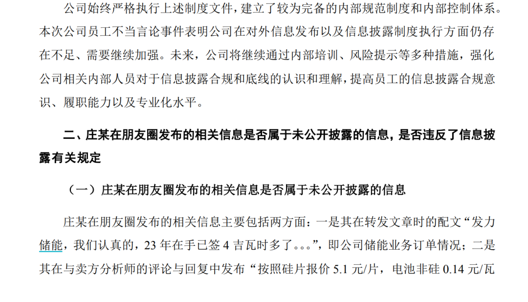 1月28日,宁波证监局披露,已对东方日升(300118.SZ)采取出具警示函的行政监管措施。理由是公司员工庄某于1月9日在微信朋友圈称公司储能业务“23年在手已签4吉瓦时多”,并在评论中与某券商分析师讨论上市公司组件成本、交付价格、未来业绩等,构成违规披露上市公司未公开信息,对市场造成不良影响。