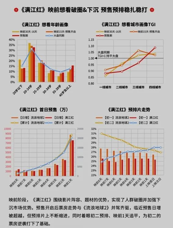而根据今年春节档期间三四线城市人次占比,则明显看出今年因为更多人选择回家过年,下沉市场占比远超过2022年和2021年同期,所以《满江红》赢在了下沉。