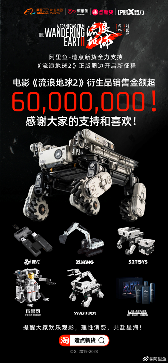粉丝的凝聚效应就是生产力,截至1月28日,阿里旗下的阿里鱼、造点新货和多家品牌共同打造的《流浪地球2》官方正版周边衍生品,销售额已经突破了6000万,能够达到如此规模,「流浪地球」的IP在现实的影响力已经首屈一指。