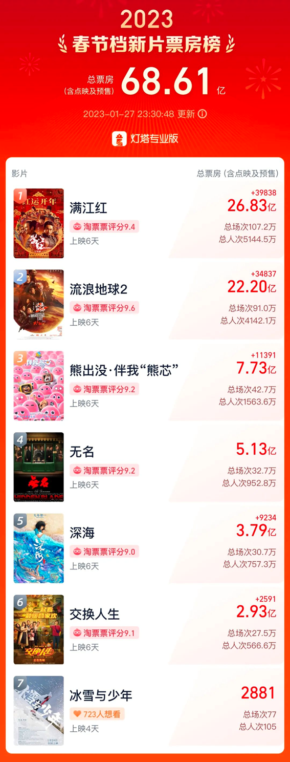 6天的2023年春节档票房大战,最终定格在了68亿的总票房,这是仅次于2021年春节档、影史第二的成绩。