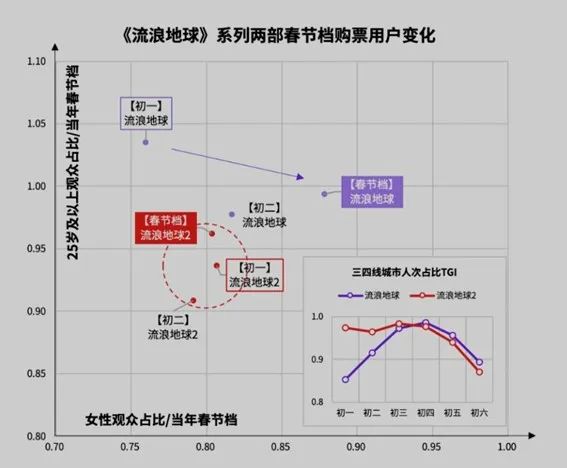 猫眼研究院的《2023春节档数据洞察》认为,《流浪地球2》没有达到2019年的出圈效果,是向女性观众和下沉市场推进有限,「独享男性区间的《流浪地球2》仍有充足的挖掘空间,伴随着春节返岗,一二线城市的优势将持续放大。」
