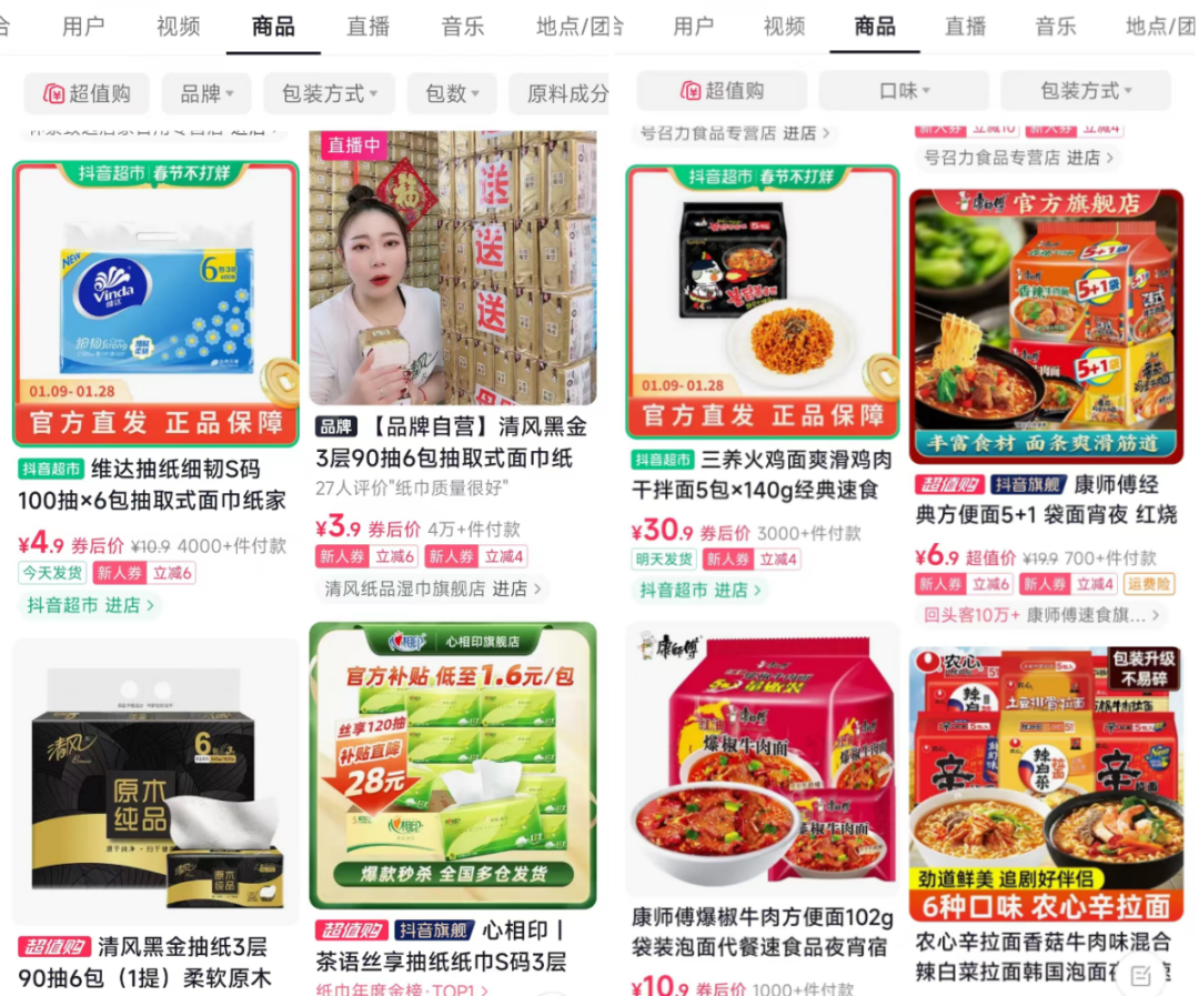 而用户在抖音商城中看到抖音超市商品,会普遍感觉到“便宜”。原因是,在抖音搜索场景下的“商品”频道,抖音超市商品显示的是计提平台新人专享券的券后价。如维达S码100抽 x 6包抽取式面巾纸,商城显示价格为券后价4.9元,点击进入抖音超市后显示原价为10.9元,新用户可领取6元新人限时专享券。
