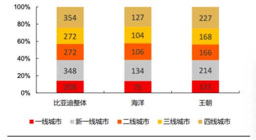 比亚迪一向注重对低线城市的布局。根据长江证券在2022年6月份的一份报告,比亚迪在四线城市的店面数量占比,约为25%。