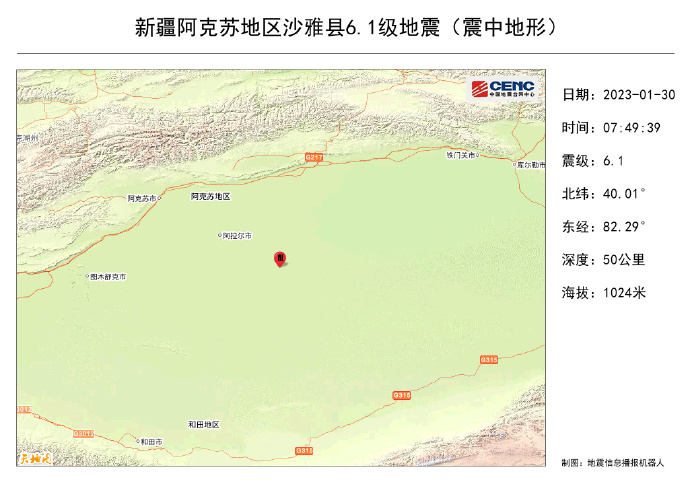 中国地震台网正式测定,2023年1月30日7时49分在新疆阿克苏地区沙雅县(北纬40.01度,东经82.29度)发生6.1级地震,震源深度50千米。