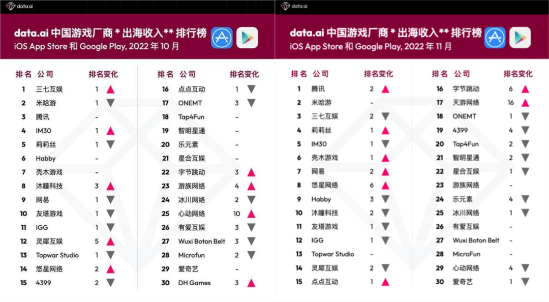 据Data.ai公布的中国游戏厂商出海榜单,2022年10月三七互娱位居榜首;但时隔一月后,其排名再次回落至第三名。