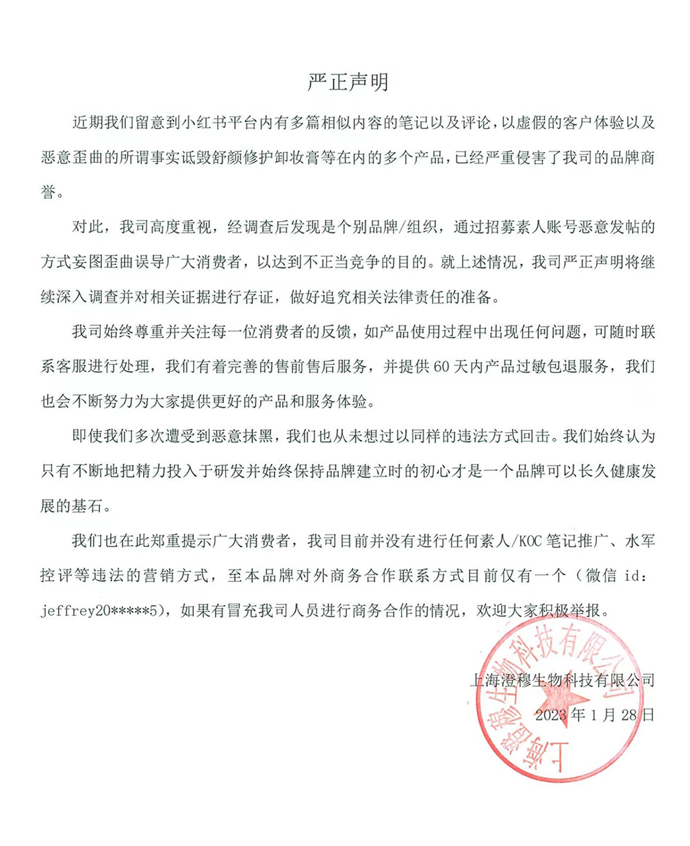 且初方独家回应CBO称,“自2021年10月以来,恶意抹黑对品牌声誉造成不可估量的伤害,除此之外,且初作为国货品牌,支持所有中国品牌力量,但是我们不接受在国货之间引战、恶意拉踩的不正当行为,以及用非法手段获取流量密码的行为。”