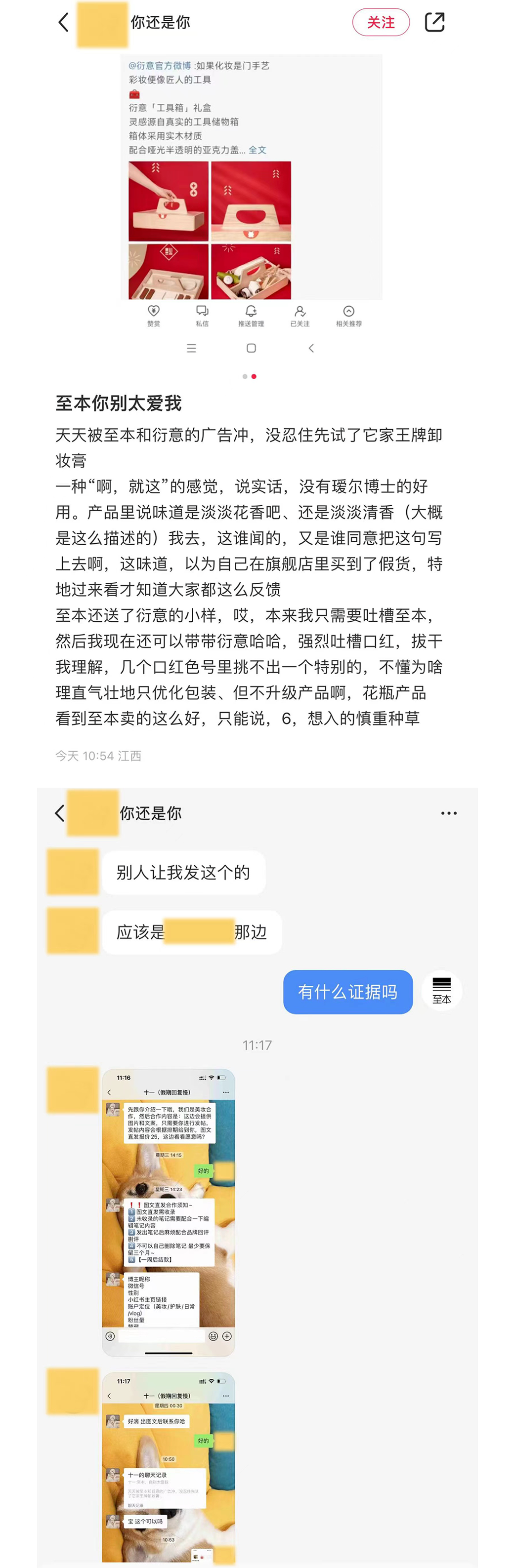 至本同时贴出了疑似恶意抹黑的小红书笔记截图,及所谓抹黑人士招募素人对至本进行抹黑的对话截图。内容聚焦于吐槽舒颜修护卸妆膏等产品“味道难闻”“使用感差”等等。