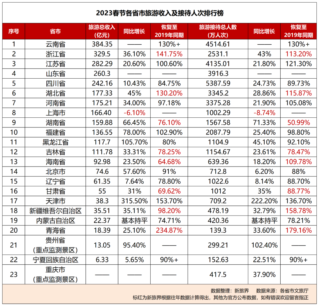 同比2022年,黑龙江省、贵州省与天津市在旅游收入和旅游接待人次方面的增长都极为突出;某种意义上这并不令人意外——这三地都并非旅游的热门目的地,但在疫情三年间,在配套设施建设,基础服务提升与文旅产品打造上都有了明显的提升;而同比2019年,云南省、青海省、天津市、浙江省、江苏省、湖北省的旅游收入和接待人次都已实现反超。
