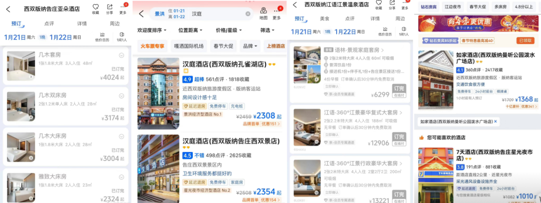 春节假期期间,作为今年春节游的“大热选手”西双版纳经济型酒店的价格已经突破千元,以除夕当天入住价格为例,据携程APP,汉庭酒店(西双版纳告庄西双景店)当晚的最低价格要2189元;7天酒店(西双版纳告庄星光夜市店)当晚最低价格要1066元,且已售罄;锦江之星酒店(西双版纳景洪泼水广场店)当晚最低价格要1191元。而这些酒店淡季时,最低价格141元/晚到207元/晚之间不等。这意味着,春节期间的这些经济型酒店的价格至少涨了超10倍。