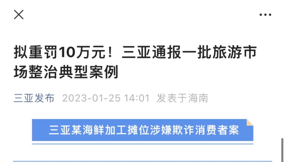 1月25日,三亚公布了5起旅游市场典型违法案例,例如调换海鲜材料、未落实裸秤销售、私改价格等,均是已被整肃多次的“经典”宰客套路。而在旅游地广西北海,也有游客反映就餐消费时被宰,“4个菜1500块”。