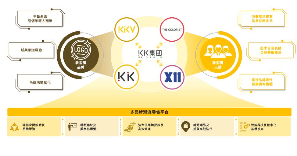 2019年,吴悦宁将公司升级为KK集团,并接连在当年5月和10月新推出两个品牌——主打精致生活方式集合的潮流零售品牌“KKV”、国内首个大型美妆潮流零售品牌“THE COLORIST 调色师”。截至2022年10月31日,KKV作为主力品牌拥有366家门店,THE COLORIST拥有210家门店。