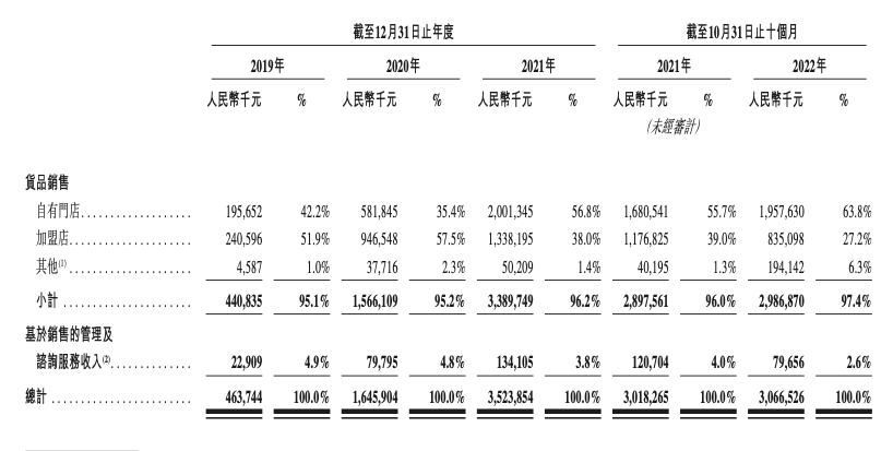 2019-2022年前10个月,KK集团自有门店的销售额分别为1.96亿、5.82亿、20.01亿、19.58亿元;加盟店的销售额则分别为2.41亿、9.47亿、13.38亿、8.35亿元。其中,自有门店的销售占比由2019年的42.2%,增长至目前的63.8%;加盟店的销售占比则由2019年的51.9%降至如今的27.2%。