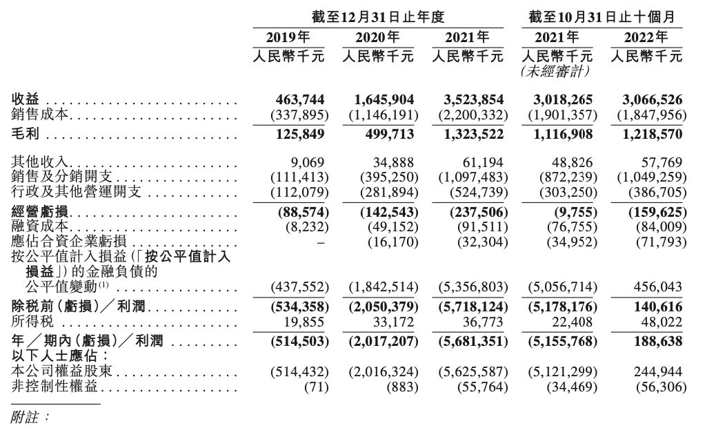2019-2021年及2022年前10个月,KK集团毛利分别为1.26亿、5.00亿、13.24亿、12.19亿元;经营亏损分别为8857.4万、1.43亿、2.38亿、1.60亿元;净利润分别为-5.15亿、-20.17亿、-56.81亿、1.89亿元。