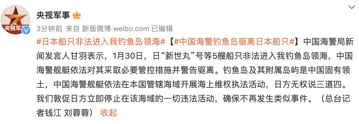 据@央视军事 微博消息,中国海警局新闻发言人甘羽表示,1月30日,日“新世丸”号等5艘船只非法进入我钓鱼岛领海,中国海警舰艇依法对其采取必要管控措施并警告驱离。钓鱼岛及其附属岛屿是中国固有领土,中国海警舰艇依法在本国管辖海域开展海上维权执法活动,日方无权说三道四。我们敦促日方立即停止在该海域的一切违法活动,确保不再发生类似事件。
