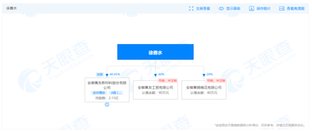 资料显示,徐善水为集友股份的发起人,出生于1869年,本科学历,安徽省第二批战略性新兴产业技术领军人才。曾任丰原生化(现中粮生化,000930.SZ)董事、副总经理,安徽富博精细化工股份有限公司总经理;现任安徽集友新材料股份有限公司董事长、总裁。