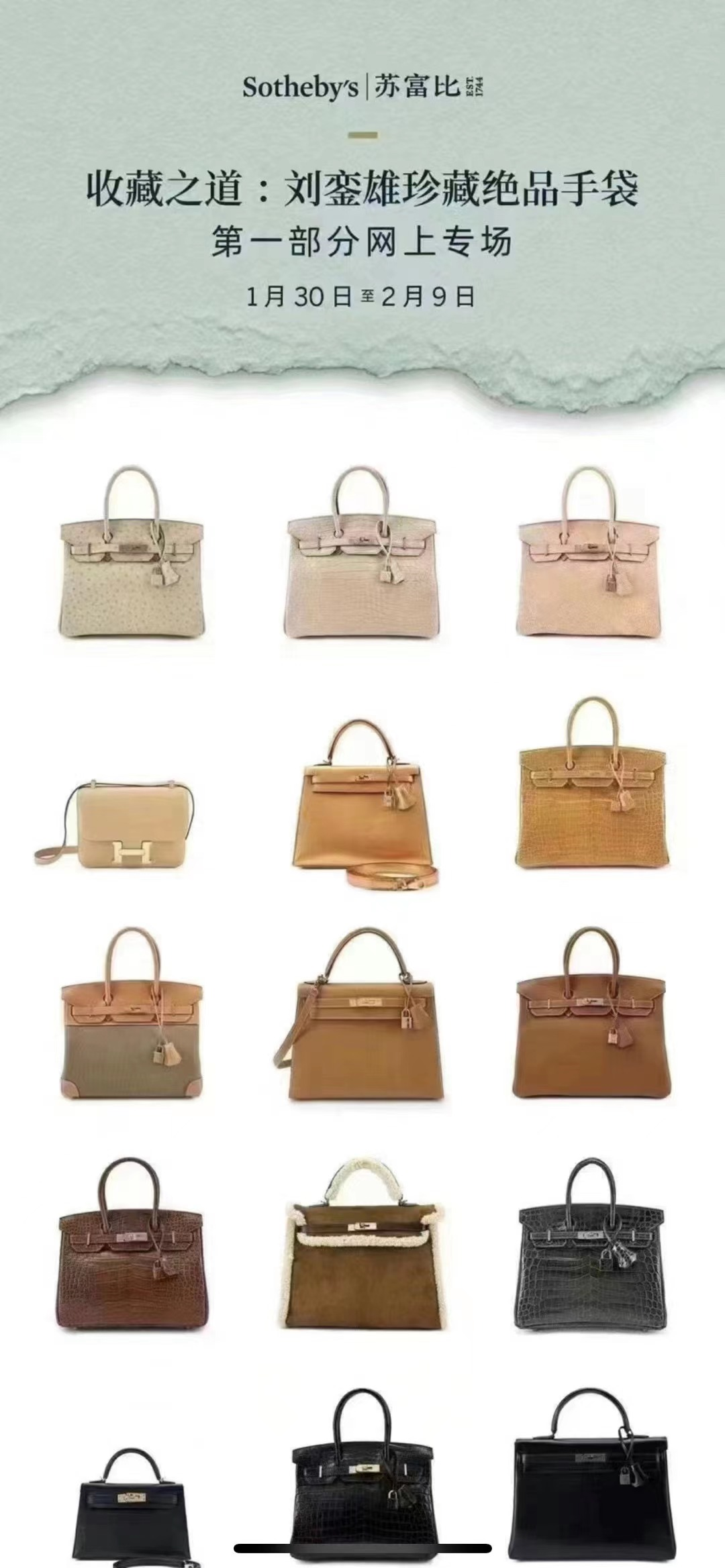 1月30日,刘銮雄与苏富比拍卖行合作的《收藏之道:刘銮雄珍藏绝品手袋》第一部分网上专场开启。苏富比称,此次是亚洲史上最大型单一藏家手袋拍卖。