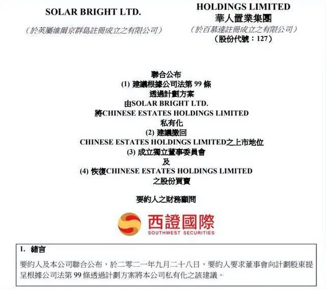 按照华人置业提出私有化方案,计划以4港元/股价格回购公开市场约25%的股份,将华人置业私有并撤回上市地位。虽然回购价格比公告前最后一个交易日的收盘价溢价83.5%,不过股东们并不买账,认为回购价过低。
