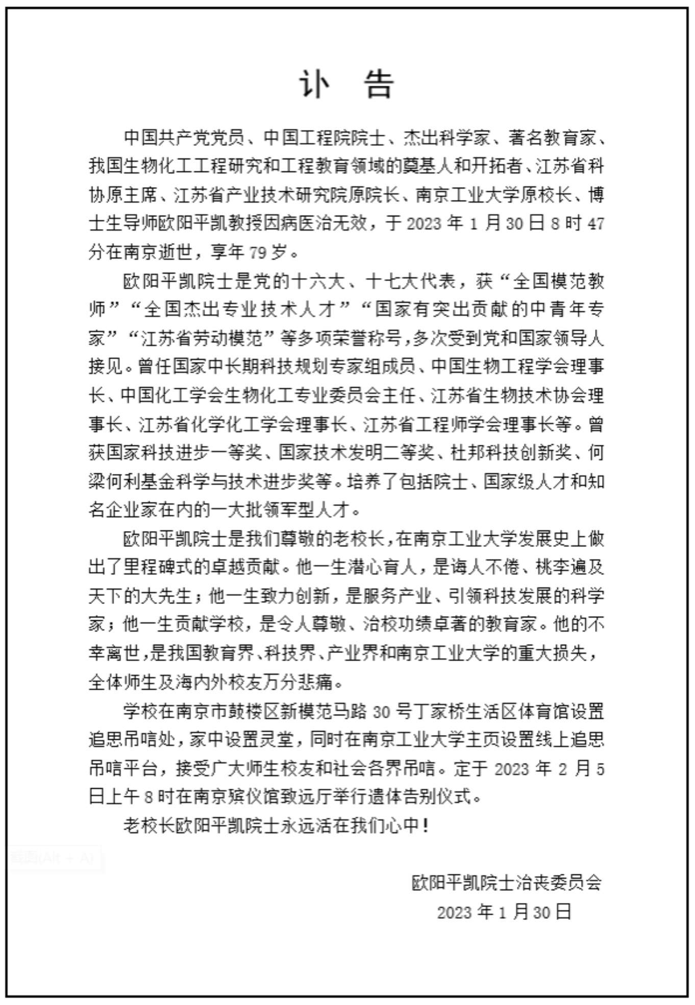 南京工业大学网站1月30日发布讣告,中国共产党党员、中国工程院院士、杰出科学家、著名教育家、我国生物化工工程研究和工程教领域的奠基人和开拓者、江苏省科协原主席、江苏省产业技术研究院原院长、南京工业大学原校长、博士生导师欧阳平凯教授因病医治无效,于2023年1月30日8时47分在南京逝世,享年79岁。