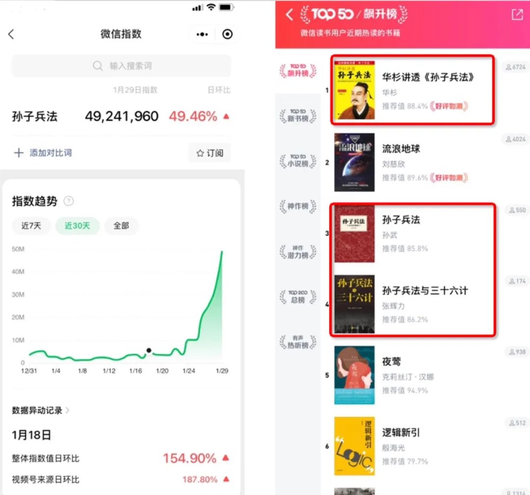 在其他平台,《孙子兵法》的销量同样在狂飙。开播以来关键词“孙子兵法”在微信指数上升至近5亿,微信读书app《孙子兵法》现在已经占据了TOP50飙升榜的第一,讲解和原著版本占据了前五中的三席。在当当网,目前《孙子兵法》也是古籍榜销冠,其他各版本也跻身排行榜前列。
