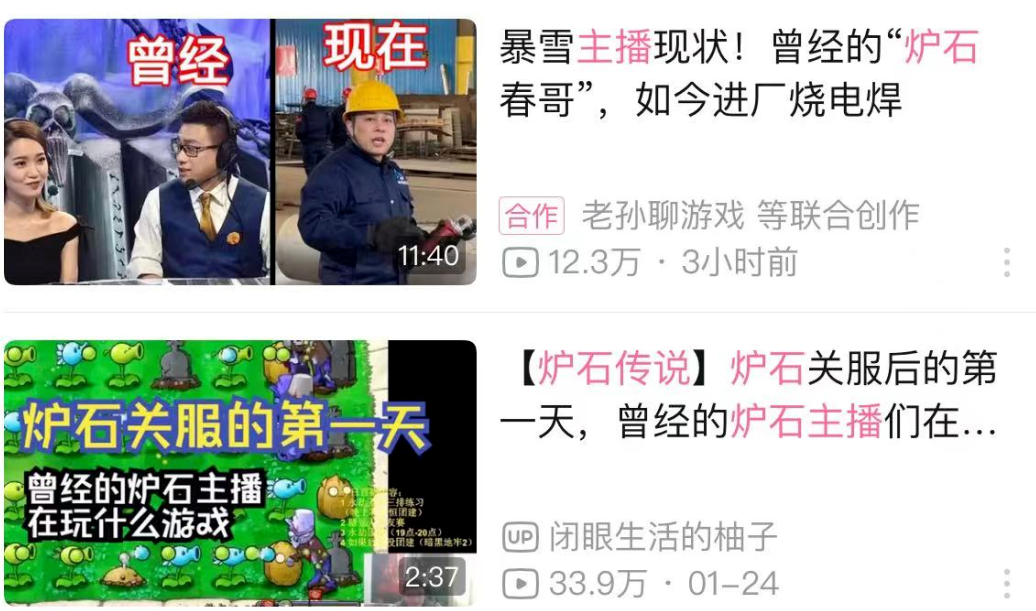 有游戏主播曾称,在暴雪网易官宣“分手”不久,B站炉石主播群公告开始鼓励所有炉石主播转播其他游戏,这个群才刚刚组建了2个月。为了帮助这些主播转行,官方给出了一系列方案,并给予流量上的支持。而在暴雪寻找新代理商、炉石传说在国内正式停服之后,炉石传说主播们聚在一起玩起了《鹅鸭杀》调侃自己为“下岗再就业”。