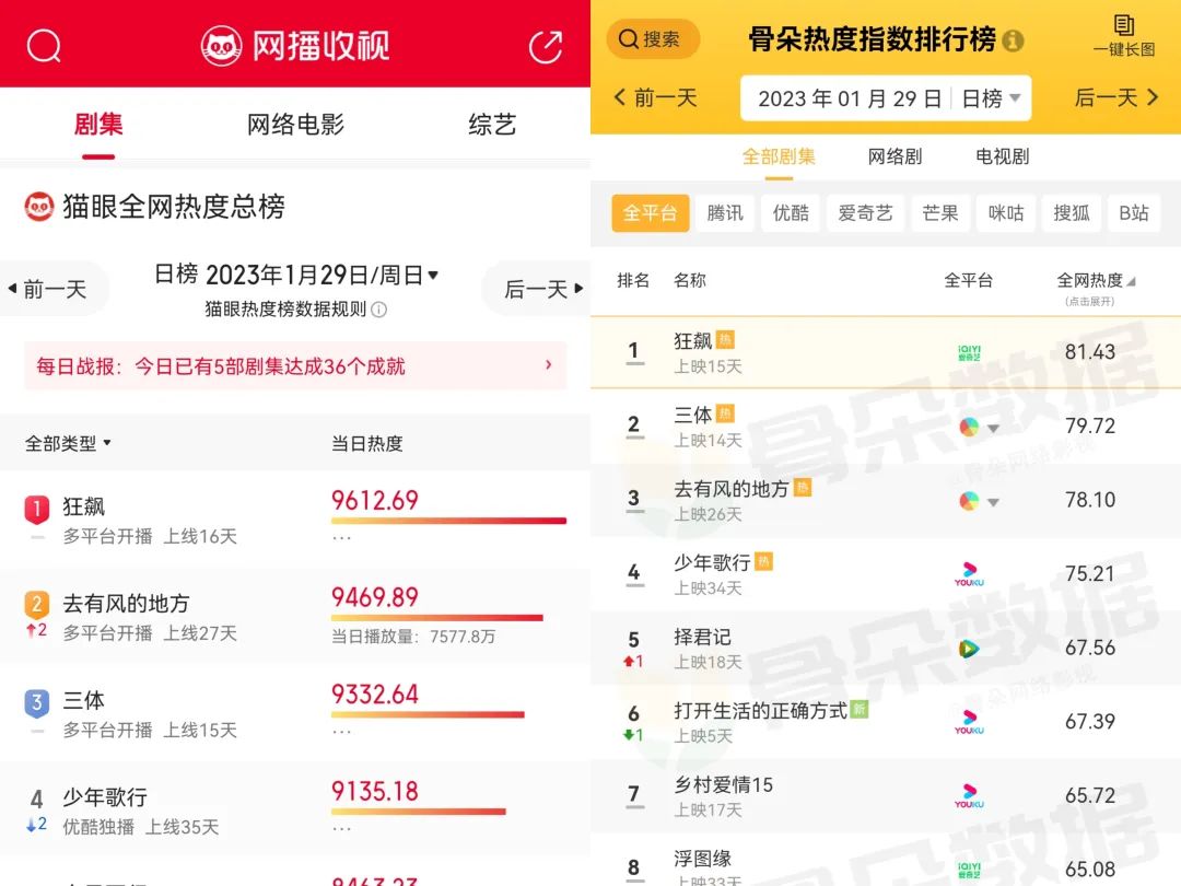 从热度方面来说,在各大数据榜单中,这些热门剧集也同样霸榜。在猫眼全网剧集热度总榜中,《狂飙》《去有风的地方》《三体》《少年歌行》等连续多日霸占前位;在骨朵热度指数排行榜中也同样如此。