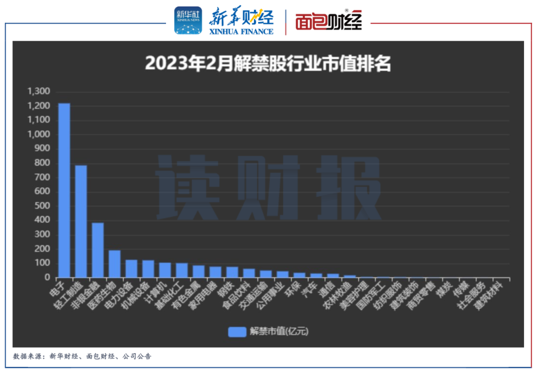 2023年2月,A股将有190家公司的限售股面临解禁,合计解禁量约为152.78亿股,解禁规模超3000亿元,在全年中处于中等规模。从行业分布来看,电子、轻工制造、非银金融解禁市值分别位列前三。其中,公牛集团解禁规模居首,解禁市值超700亿元。