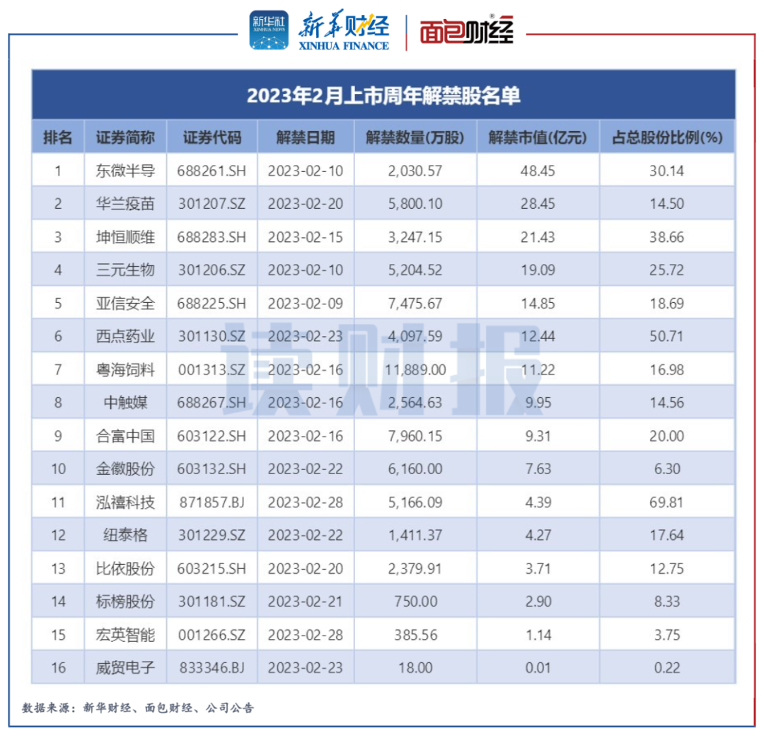 此外,共有16家公司、6.65亿限售股于2月迎上市周年解禁,解禁市值近200亿元,包括东微半导、华兰疫苗等企业。