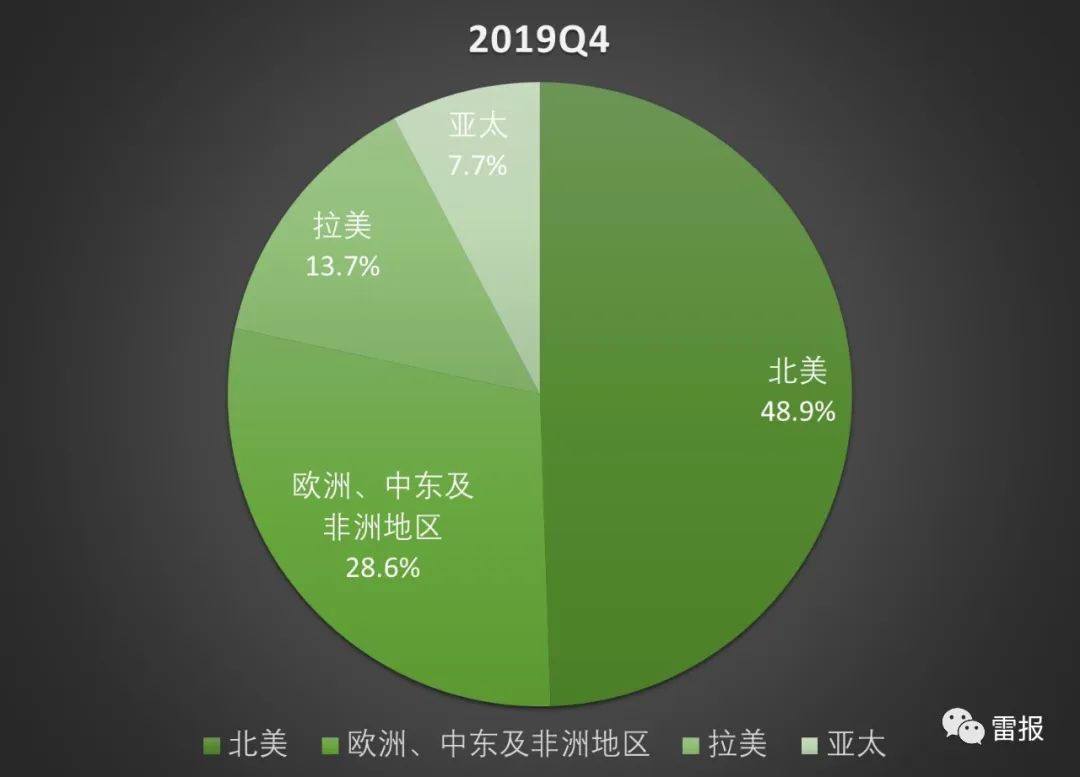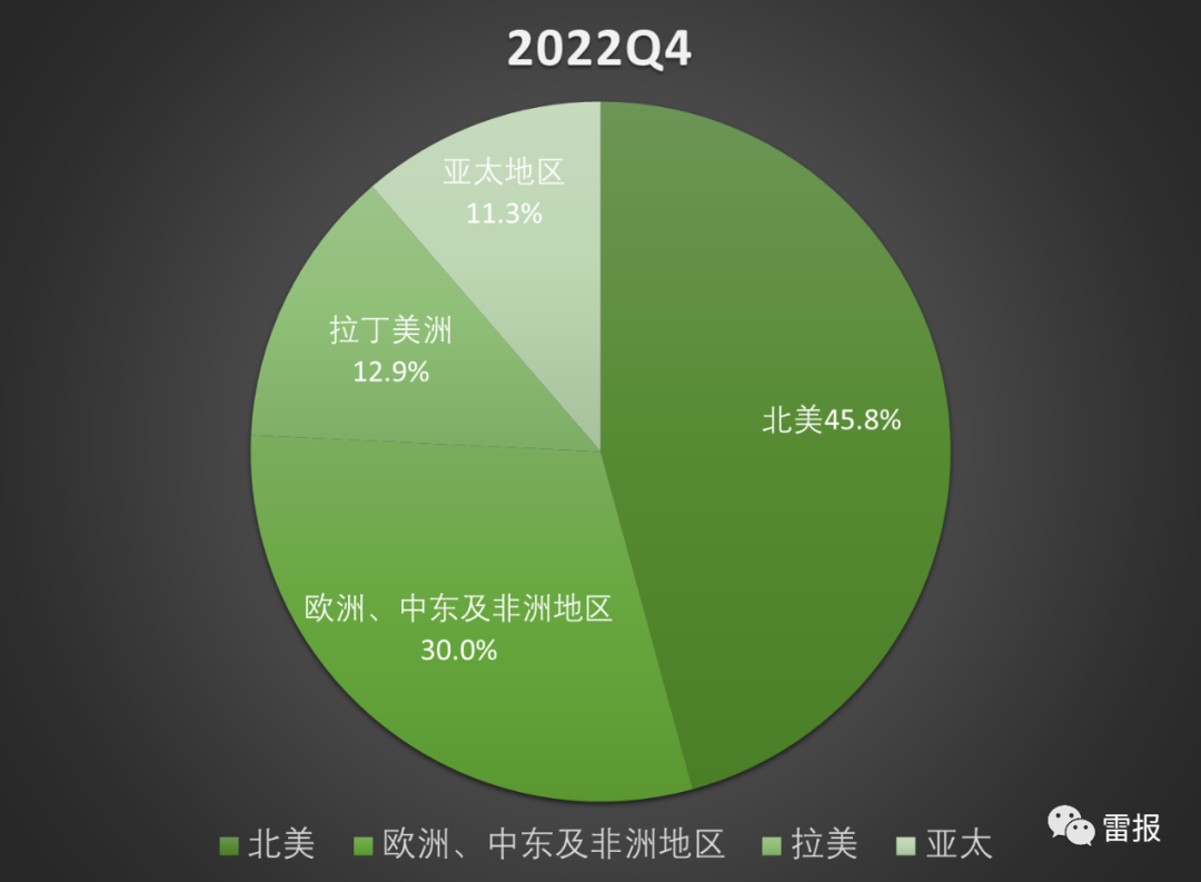 从收入来看,北美地区仍是绝对主力。截至2022年末,北美地区总营收140.84亿美元,占总营收的比例高达45%;欧洲、中东和非洲次之,营收97.45亿美元,占比31%;拉丁及亚太地区分别为40.69亿美元和35.70亿美元,分别占13%和11%。不过从单季度来看,北美地区营收占比已从2019年Q4的48.9%下降至2022年Q4的45.7%,同期亚太地区则7.7%增至11.3%,从4.18亿美元翻倍至8.56亿美元。