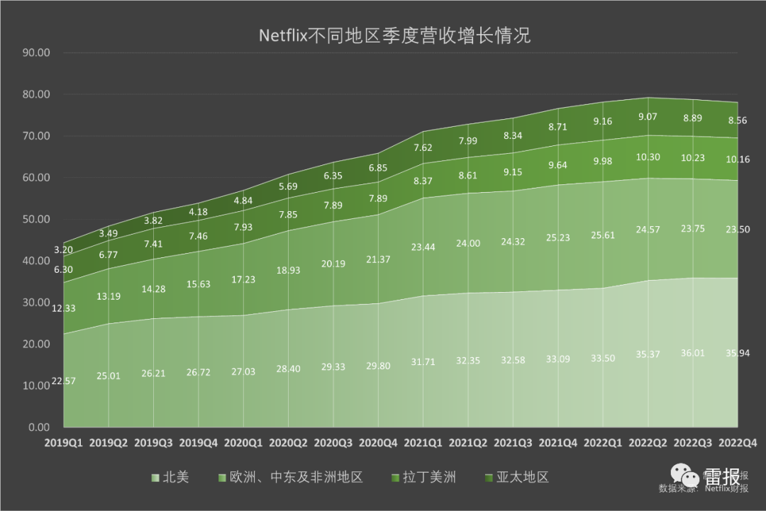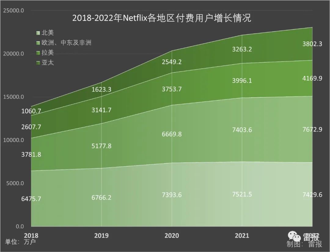 2020-2022年,即疫情以来的这三年间,亚太地区付费会员数从1623.3万直接翻倍至3800万+,其中整体会员增长下滑的2022年净增量也达到了539万(占比净增长60%),是年内Netflix增长最为迅速的地区,超过欧洲、中东及非洲地区的269万(占比30%)。而这一年,作为大本营的北美地区付费会员人数不增反降,净减少92万,拉丁地区则增长乏力,该年度仅增长173.8万(占比19%)付费会员。