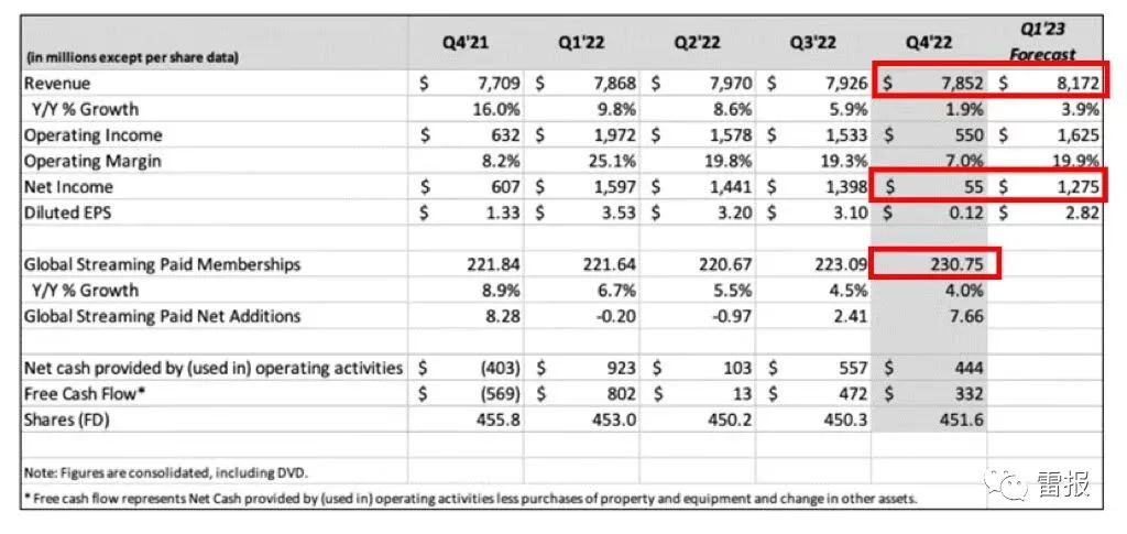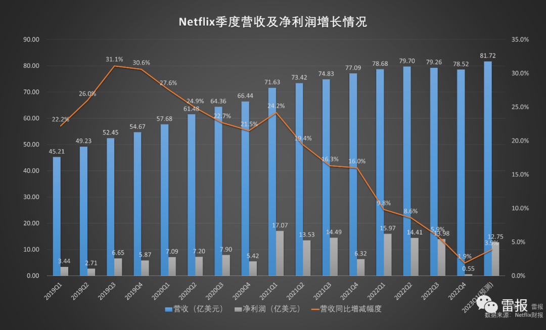 2023年1月20日(美国时间1月19日),全球流媒体巨头Netflix公布了其2022年Q4财报,据此获悉:2022年第四季度,Netflix实现营收78.52亿美元,同比增长1.9%;实现净利润5.5千万美元,与去年同期的6.07亿美元同比大幅减少91%。该季度新增付费会员近766万,远超预期的450万,创造年内季度新增最高。