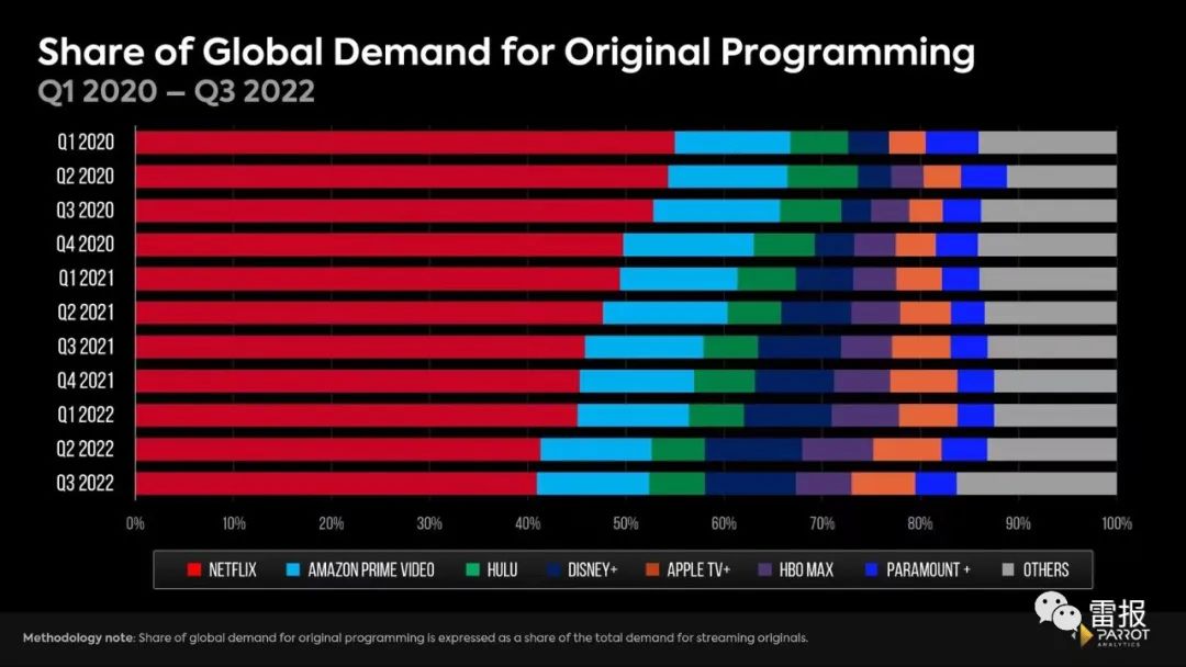 另据分析公司Parrot Analytics新发布的数据显示,2020年Q1到2022年Q3,Netflix的全球原创内容需求份额由45.8%下降了4.9%至40.9%,而同期Apple TV+、Disney+、HBO Max、Hulu、Amazon Prime Vedio、Paramount六家流媒体平台份额总和终于超越Netflix,达到42.8%。尽管从单体数据来看,目前Netflix相较于其他平台仍大幅领先,但其所遇到的竞争显然愈发激烈。
