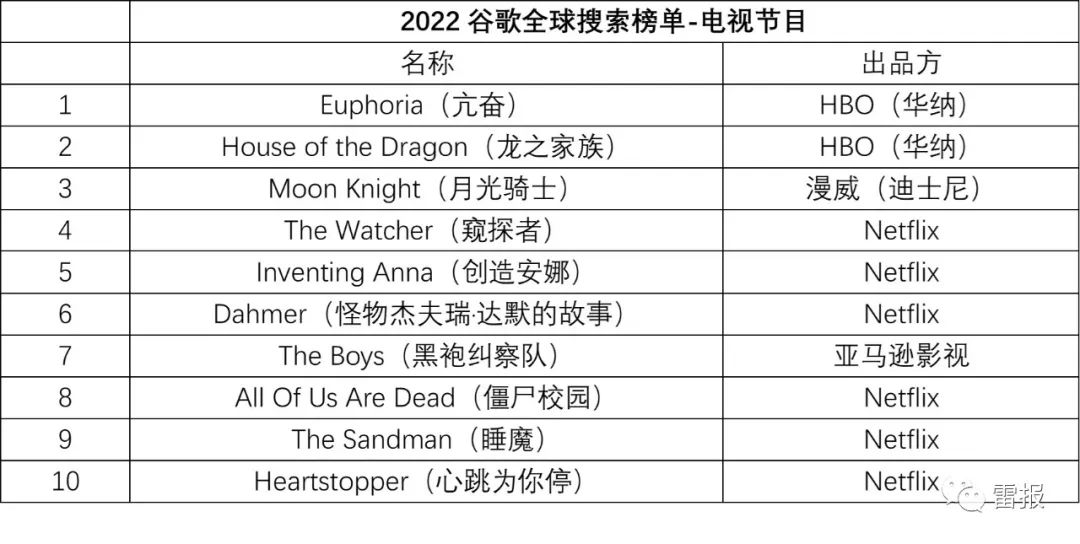 2022年谷歌全球搜索量前十名的电视剧集中,来自Netflix的共计6部,
