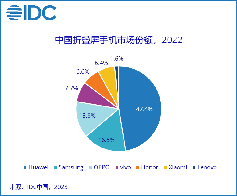 2022年头部安卓厂商全部发布了相关产品。从2022年中国的折叠屏手机市场份额来看,华为仍是牢牢占据国内折叠屏市场第一的位置,市场份额为47.4%,遥遥领先于其他厂商。
