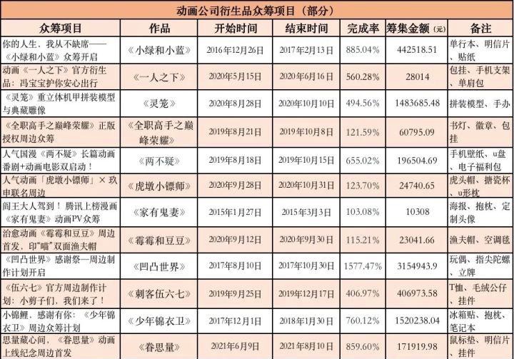 如摩点上线的周边众筹衍生项目,包括动画《一人之下》、《灵笼》、《伍六七》及动画电影《罗小黑战记》、《哪吒之魔童降世》等,多数项目的众筹超额完成,少数项目的金额达到了百万级。
