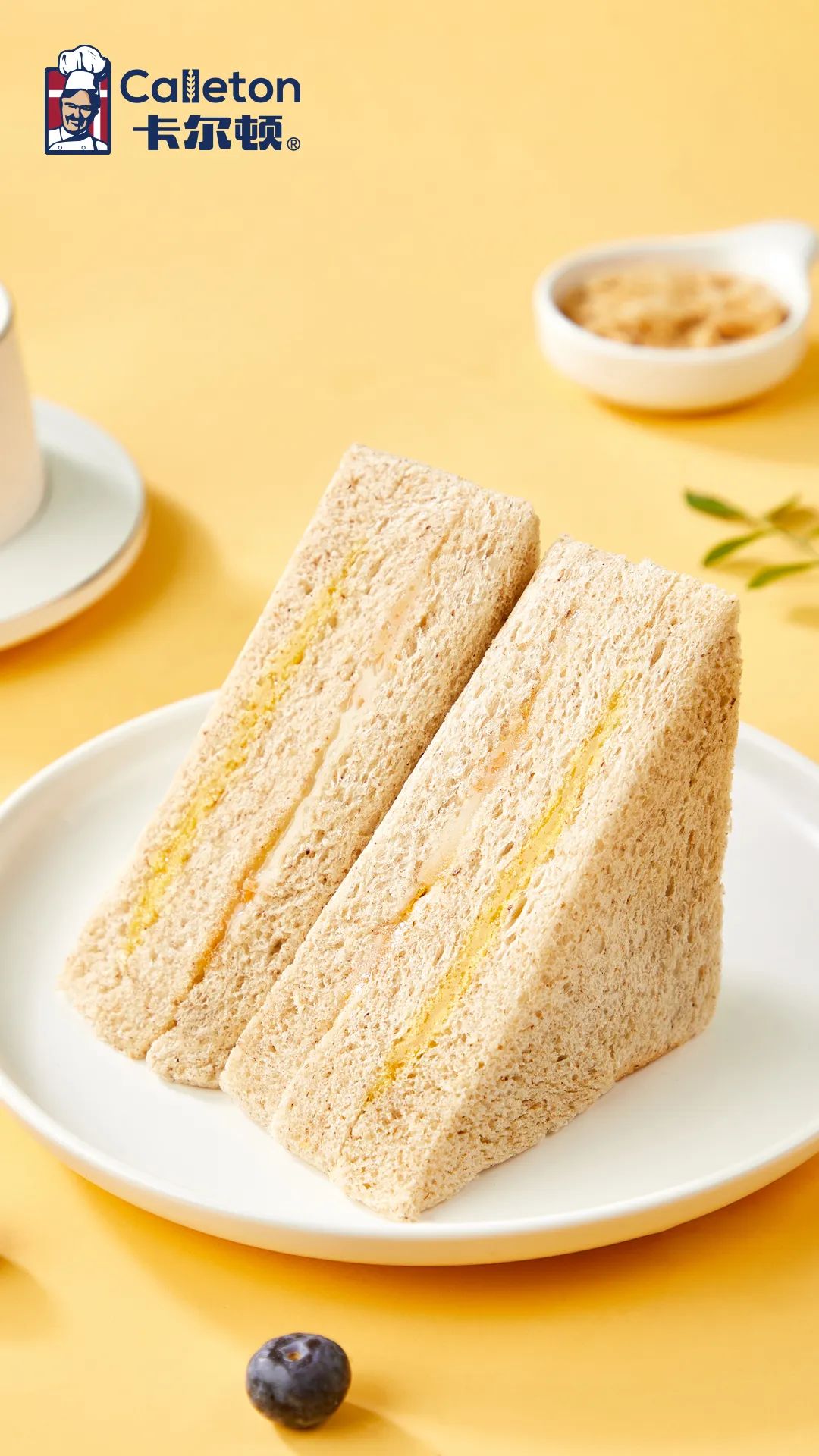 卡尔顿的黑麦三明治,针对烘焙产品粗粮化、健康化的成分升级趋势,切入营养轻食赛道,面包部分添加黑麦粉含量达25%,提供了膳食纤维,又有粗粮谷物的芬芳和咀嚼感。