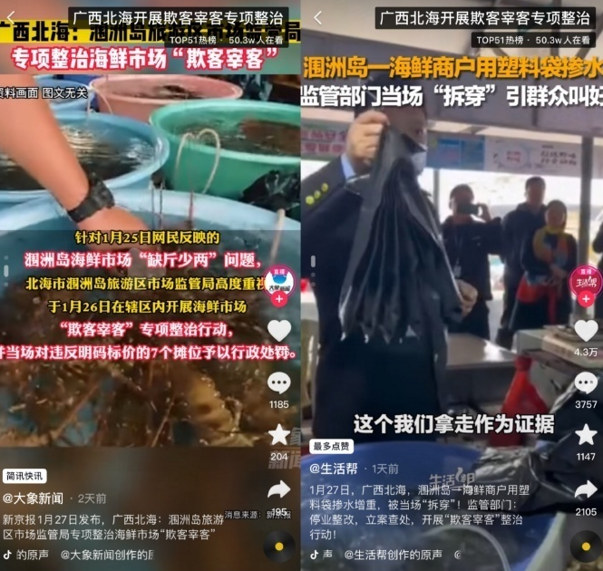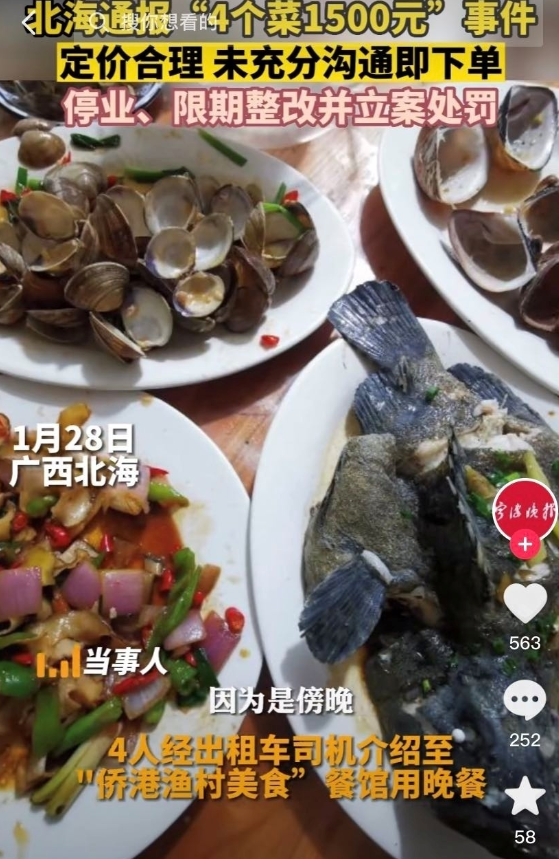 1月27日,上述“游客爆料北海用餐4个菜1500元”话题登上热搜,引发百万网友激烈讨论。随后,网友们以及相关媒体又陆续曝光了全国多家旅游餐饮“报复性宰客”的恶劣行为。