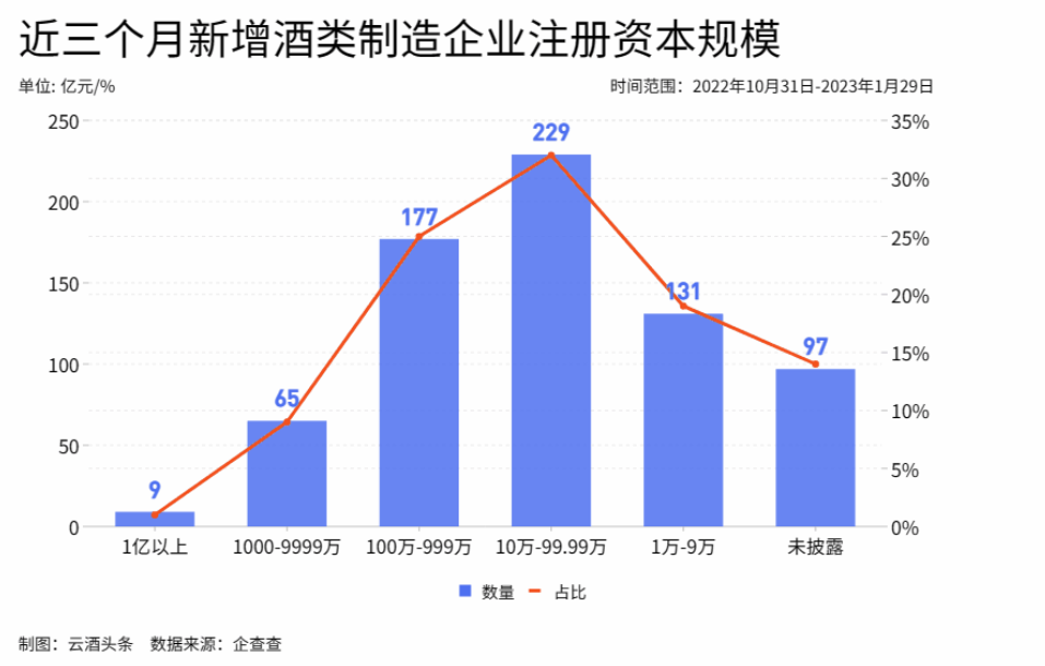 通过对近三个月(2022年10月31日-2023年1月29日)新成立的708家酒类制造企业进行梳理,云酒头条发现,新增企业注册资本合计超96亿元,其中川黔展示出了更强劲的增长势能。